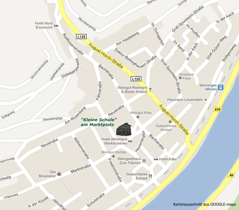 Unser Probenraum am MarktplatzSchon seit vielen Jahren haben wir “unseren Probenraum” in einemGebäude der Gemeinde Winningen finden können.Direkt am Marktplatz ist die sogenannte "Kleine Schule", die ehemaligeVolksschule zu finden. Als Erweiterung zur 1833/34 gebauten Schule in derSchulstraße (heute befindet sich hier das Wein- und Heimatmuseum),entschloss man sich 1858/59 zum Bau dieses zweiten Schulhauses. Das Hauswurde dann 1882 zu seiner heutigen Gestalt ausgebaut. Bis 1962 diente dasGebäude als Schule, heute befinden sich darin die Übungsräume von dreiWinninger Ortsvereinen, dem Trommler- und Pfeiffer-Corps Winningen, gegr.1951, der Winzer-, Trachten- und Tanzgruppe, gegr. 1923 und derWinzerkapelle 1924 Winningen.In vielen Arbeitsstunden wurde der Probenraum von den Mitgliedern der Winzerkapelle renoviert und saniert. Sowurde auch eine “Akustikdecke” mit entsprechenden Beleuchtungselementen eingebaut. Vor einigen Jahren wurde vom Gemeinderat der Austausch der zwischenzeitlich über 100 Jahre alten Fensterbeschlossen und ansprechende Fenster mit einer guten Schall- und Wärmeisolierung wurden eingebaut.Gleichzeitig wurden die veralteten Elektrospeicheröfen ausgebaut und neue Gasöfen angeschafft. Weiterhin wurdemit Unterstützung der Gemeinde von den Vereinen - zum Großteil in Eigenleistung - die Toilettenanlage saniertund ausgebaut.Zwischenzeitlich hat auch der Winninger Turnverein seine Geschäftsstelle eingerichtet, weitere Musikguppen übenin unterschiedlichen Zeitabständen, die Tanzgruppe “Spätlese” und die Möhnen proben hier ihre Tänze, dieAkteure des Moselfestspiels nutzen die Räumlichkeiten usw. usw. Die “kleine Schule” am Marktplatz ist damit einHaus für viele Winninger Bürgerinnen und Bürger geworden.Die Mitglieder der Winzerkapelle - sicherlich auch alle anderen Vereine “der kleinen Schule” - sind der GemeindeWinningen sehr dankbar in diesem Gebäude “ihre Heimat” gefunden zu haben.